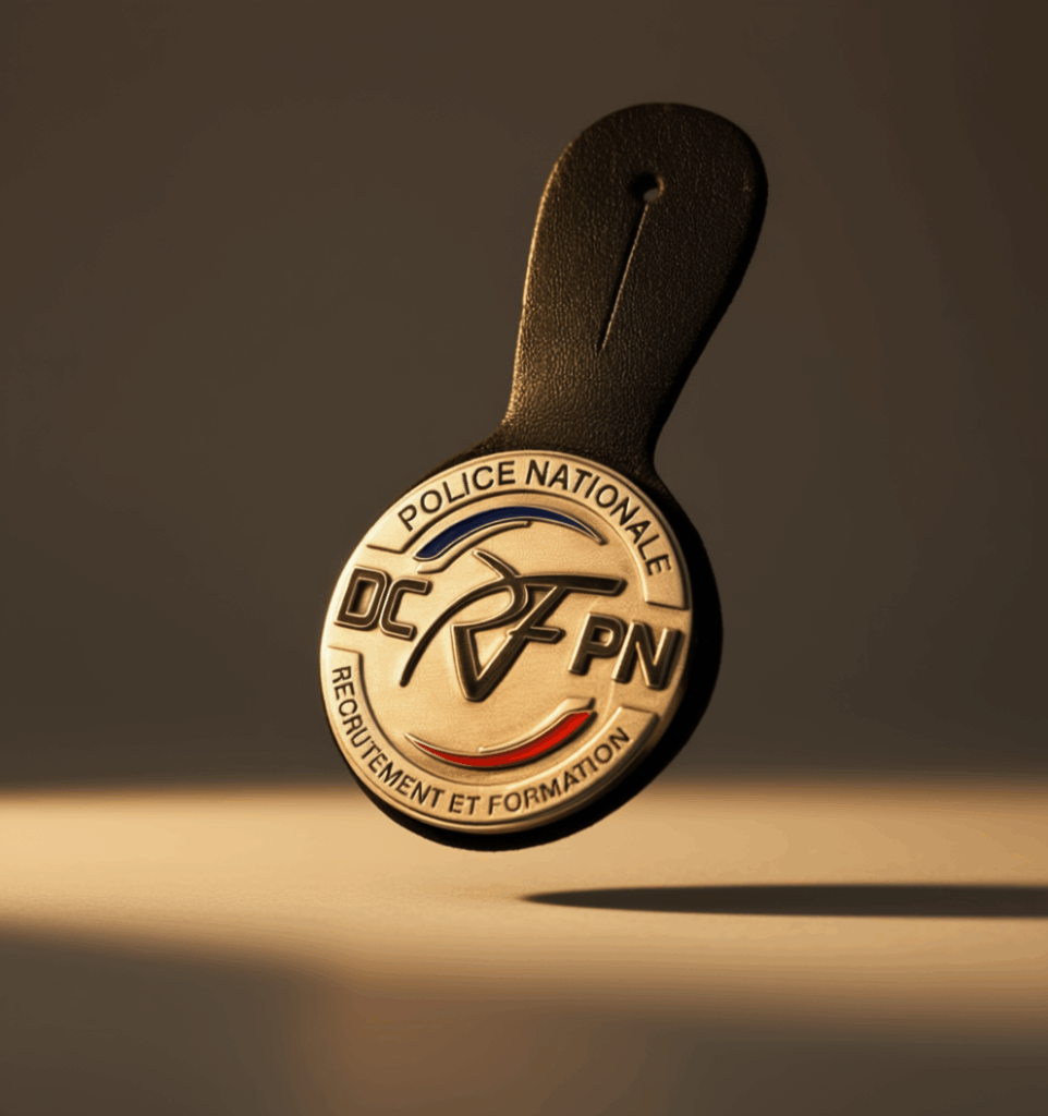 Insignes régimentaires ou de promotion en métal livrés seuls ou montés sur cuirs. Les insignes sont réalisés à plat ou en relief (2D ou 3D -ronde bosse), avec émaillage posé en eau ou surfacé pour affleurer sur le métal.